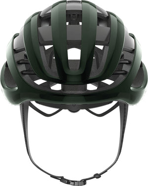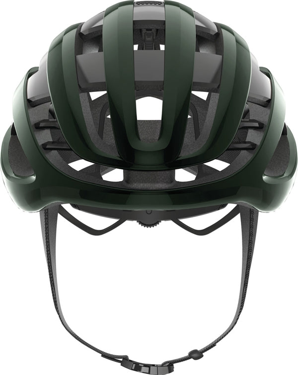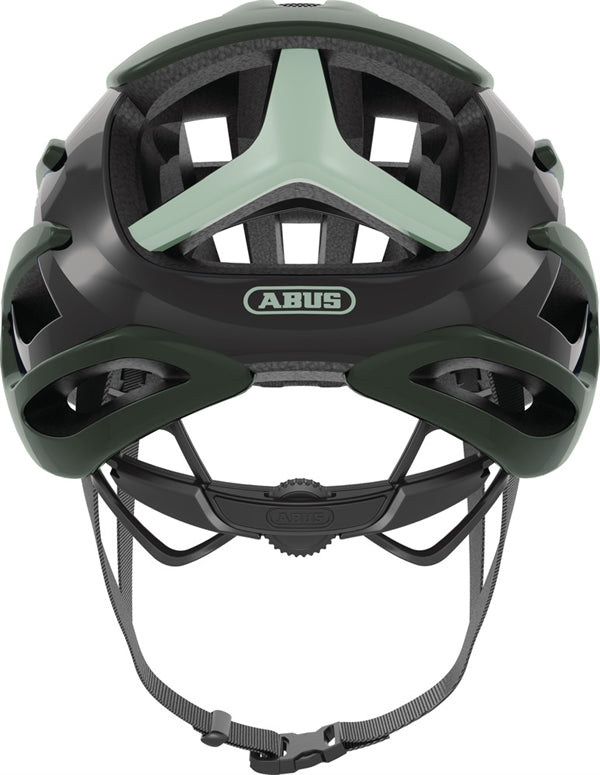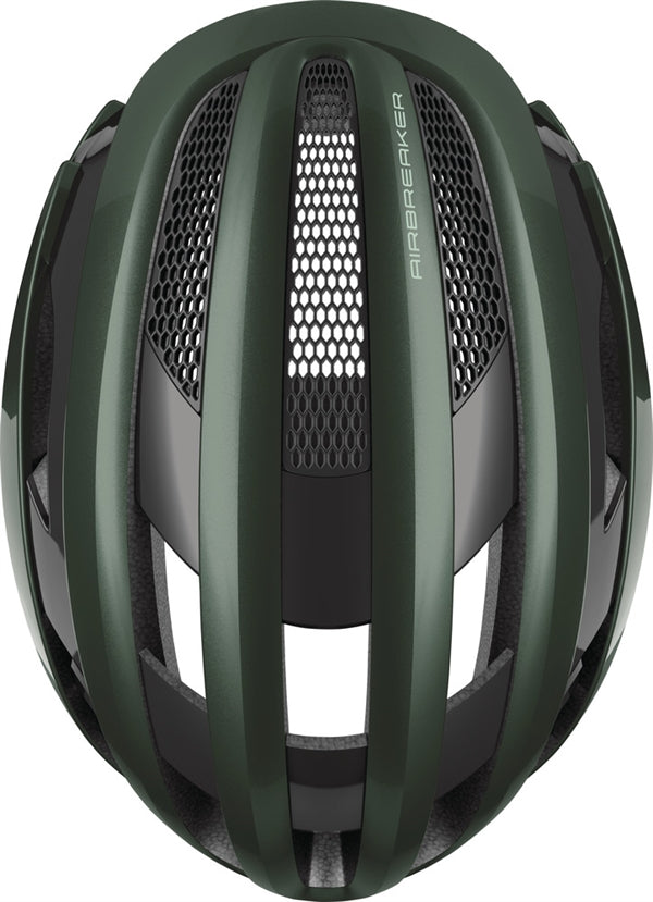 Abus Airbreaker Moss Green. Abus har nyudviklet en racerhjelm i samarbejde med Team Movistar. Det er blevet til et unikt design til den krævende landevejsrytter. Der er lagt fokus på ventilation/afkøling og aerodynamik. Multi Speed design tilbyder ventilation som ryttere ønsker det: maksimal ventilation på langsommere kuperede ruter og optimal aerodynamik i hurtigt fladt terræn. Zoom Ace skruespænde i nakken for individuel tilpasning.