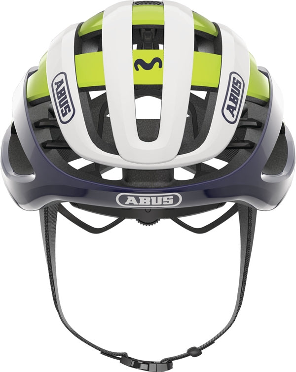 Abus Airbreaker Movistar 2023-2024. Abus har nyudviklet en racerhjelm i samarbejde med Team Movistar. Det er blevet til et unikt design til den krævende landevejsrytter. Der er lagt fokus på ventilation/afkøling og aerodynamik. Multi Speed design tilbyder ventilation som ryttere ønsker det: maksimal ventilation på langsommere kuperede ruter og optimal aerodynamik i hurtigt fladt terræn. Zoom Ace skruespænde i nakken for individuel tilpasning.