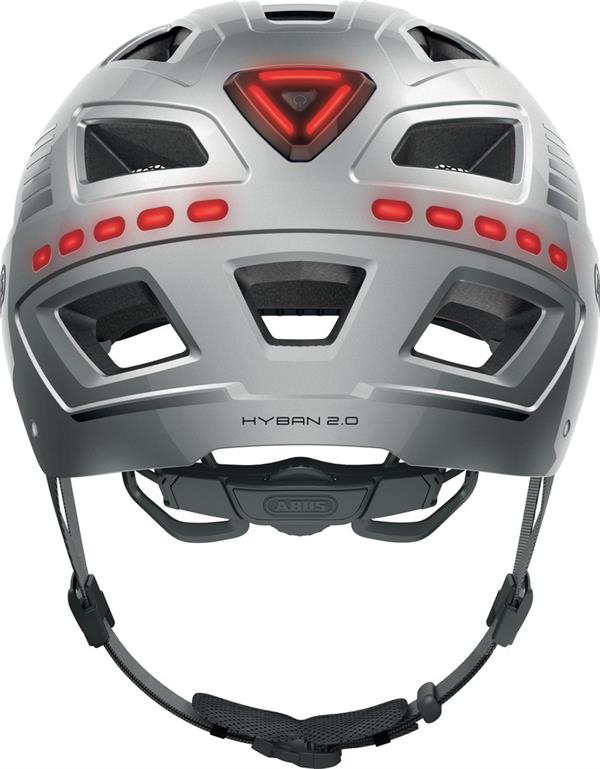 Abus Hyban 2.0 Led Signal Silver Shiny er en urban cityhjelm med ekstra synlighed. Abus har indbygget et batteri som du oplader via Micro USB. Der er 3 lysfunktioner. Eco Mode, Eco Flash Mode og Power Flash Mode. Betjenes nemt med tryk på knap. Cykelhjelmen har bløde stropper og puder for optimal komfort. Kombinationen af en hård robust yderskal med store ventilationshuller er perfekt til citykørsel. Du får simpel hagespænde med pudebeskytter. Denne gang har Abus endelig lavet et hagespændesystem som sikrer at hagespændet ikke glider af og bliver væk. Zoom Ace Urban skruespænde i nakken for optimal bespænding. Der er plads til hestehale, da spændet kan trækkes ned. 13 luftindtag samt fluenet foran og aftagelig skygge.