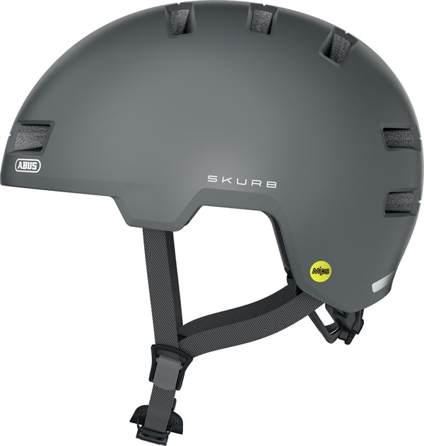 Abus Skurb Mips Concrete Grey er en lækker cykelhjelm i super flot finish. Er inmoldet og vejer mindre end normalt. God og komfortabel cykelhjelm / skaterhjelm med Mips og 12 luftkanaler, Zoom Ace skruespænde i nakken som er hestehale venlig.