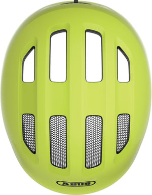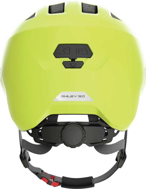 Abus Smiley 3.0 Shiny Yellow. Gennemtænkt cykelhjelm til børn. Størrelse small kan du anvende som førstegangshjelm. Abus er førende når det kommer til valg af cykelhjelm til de mindste. Størrelse medium er perfekt til de lidt større børn som stadigvæk er små. Abus Smiley modellen har igennem tiden udviklet sig løbende. Denne model har udvidet dækning ved kanterne som beskytter mere af hovedet. Skruespændet i nakken kan spændet ind og ud og så kan det også flyttes op og ned. Dette er hestehale kompatibelt. Du får også integreret insektnet og reflekser.