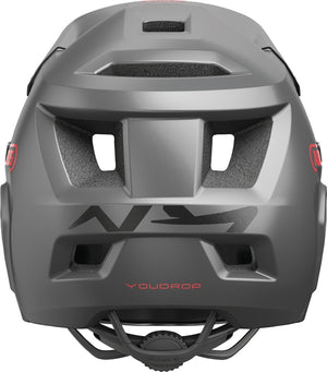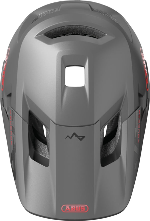 Abus YouDrop FF Ti Silver. Børnestørrelse. Fullfacehjelm til MTB, Downhill og BMX. Abus YouDrop FF cykelhjelm er en fremragende hjelm til børn, der kan lide at cykle på mountainbikes eller BMX-cykler. Cykelhjelmen har et sporty look og er både stilfuld og funktionel. Abus YouDrop er designet med fokus på sikkerhed og komfort, så du kan have ro i sindet, når dit barn er ude og cykle. Aftagelig kæbebeskytter giver ekstra beskyttelse og fleksibilitet, så cykelhjelmen kan bruges til en bred vifte af cykelaktiviteter. Den klikkes af og på.