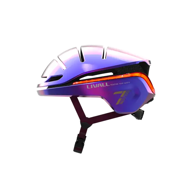 Livall Evo21 Ultraviolet er en smart allround cykelhjelm udstyret med den nyeste teknologi for optimal sikkerhed. Livall Evo21 kommer i et banebrydende design med synlig led lys bagtil på siderne og foran. Der er installeret bremselys bagtil, når der bremses op. Der er signalgivning via fjernbetjening, når du drejer til højre eller venstre. Sensor tænder hjelmens led lys, hvis du kører ind i en mørk tunnel.