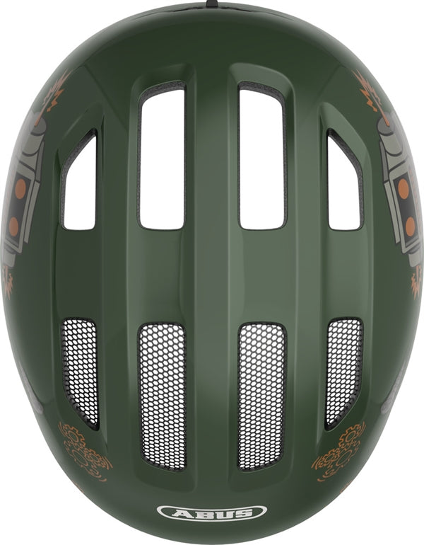 Abus Smiley 3.0 Green Robo. Fahrradhelm für Kleinkinder. Abus meistverkaufter Kleinkindhelm wurde gerade noch besser. Mit einer komplett überarbeiteten Außenform und angepassten Features tritt der Abus Smiley 3.0 LED in eine neue Ära ein. Helm erstreckt sich bis in den Schläfen- und Nackenbereich für einen besseren Rundumschutz. Höhenverstellbares Verstellsystem mit Pferdeschwanzkompatibilität für Fahrer mit längerem Haar. Integriertes Fliegennetz.