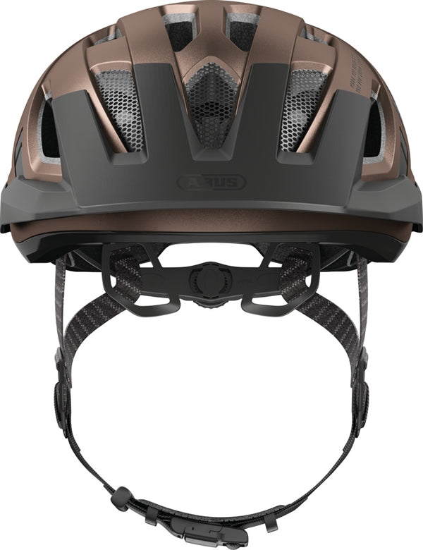 Abus Urban-i 3.0 Ace Metallic Copper. Mit der ACE-Version bekommt der Abus Urban-i 3.0 ein Upgrade, das ihm einen sportlichen Touch verleiht. Sehr modischer Fahrradhelm im Citylook mit einer tollen Passform. Am Hinterkopf befindet sich eine Verbessertes Sicherheitslampe. Fidlock-Magnet Gurtschloss, Ponytail Kompatibilität und Fliegennetz. TriVider Gurtsystem, deutlich größerem Schirm und überarbeitetem Schalenkonzept wirkt der urbane Fahrradhelm in der ACE-Version jetzt deutlich sportlicher.